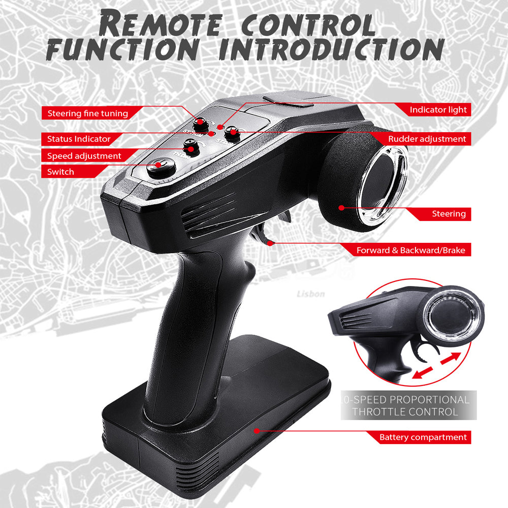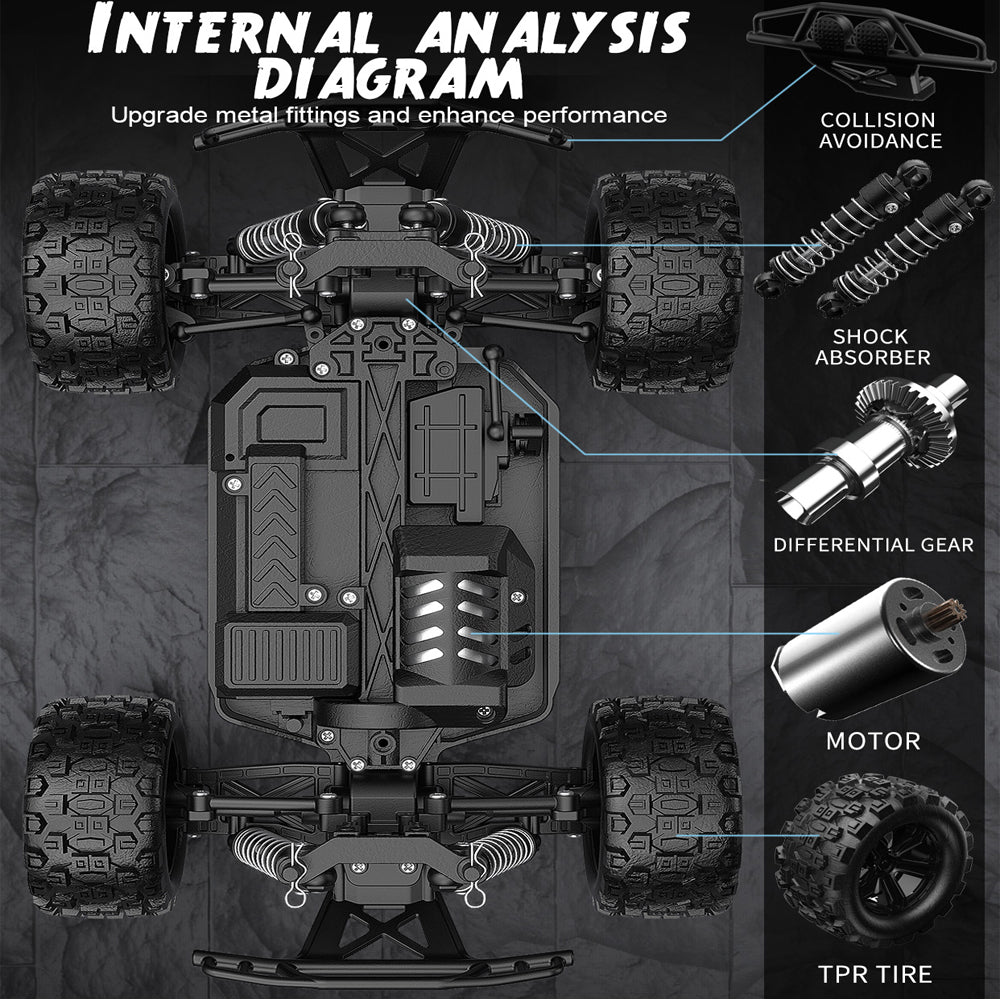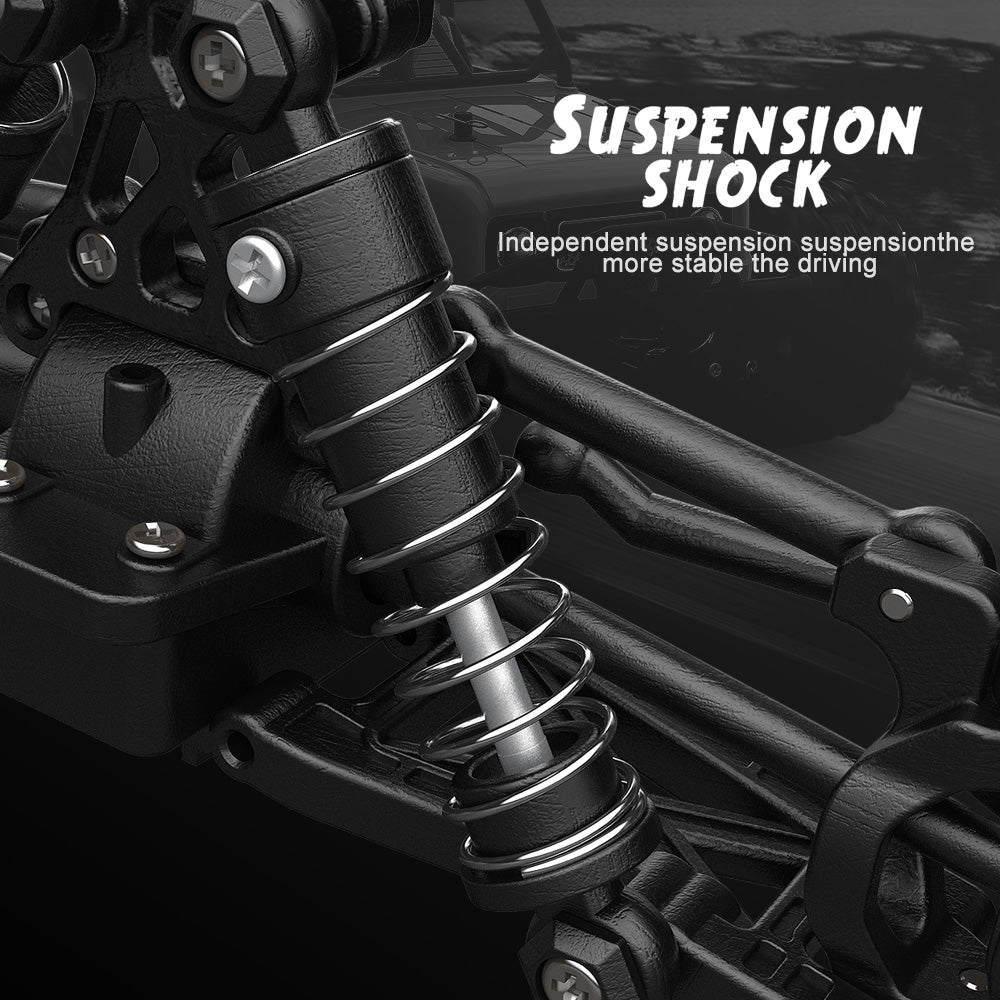 Get ready to ride in our 1:18 scale 4WD remote control car and enjoy the ultimate RC racing experience! This powerful remote control car can reach a speed of about 40KM/H and can be easily controlled from 80 meters away through a 2.4GHz remote control. At the same time, our high-speed off-road racing car is sturdy and can easily conquer rugged terrains such as gravel, grass, and sand. Its durable design includes sturdy shock absorbers to cope with impacts, as well as realistic roof searchlights to add fun.